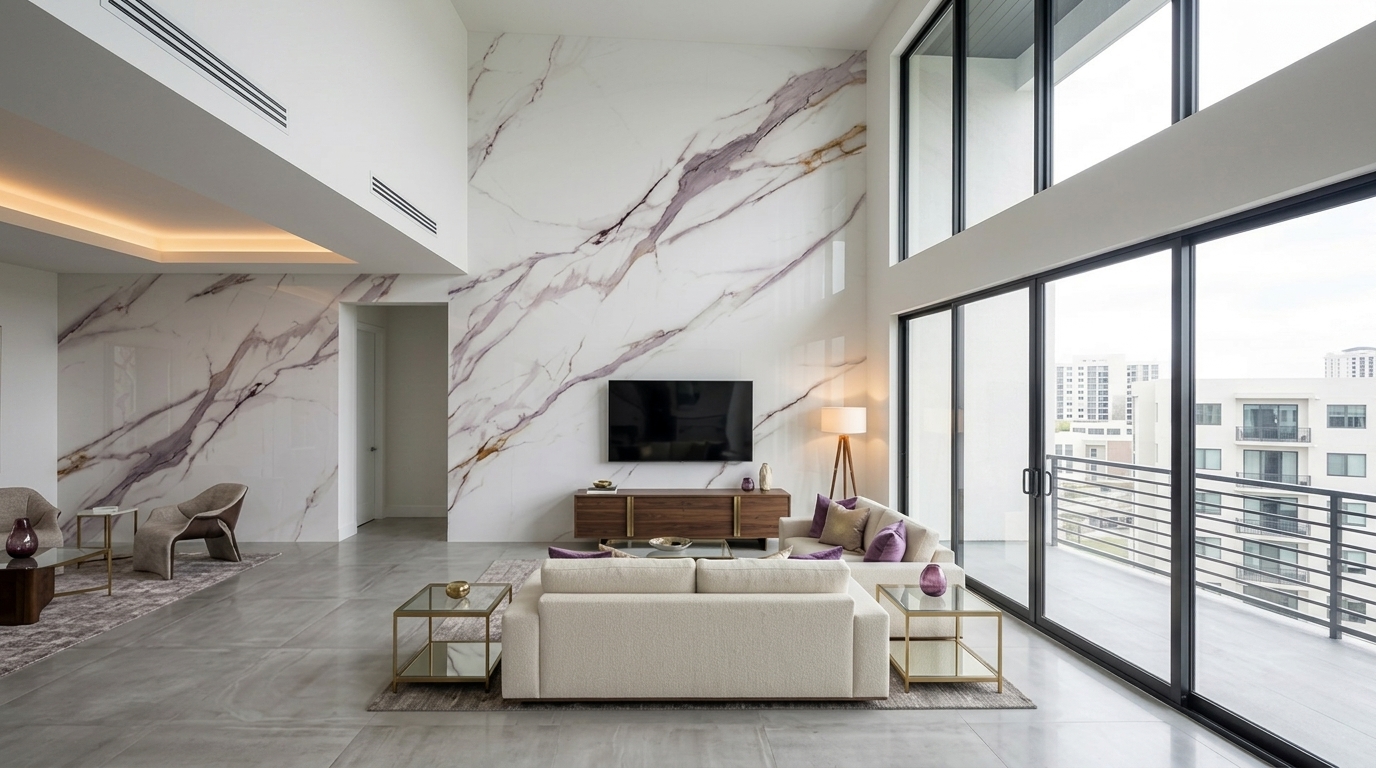 Get the heavy-hitting look of Italian stone without the masonry. Calacatta Viola PVC panels pack bold plum veins into a tough, easy-to-install sheet.